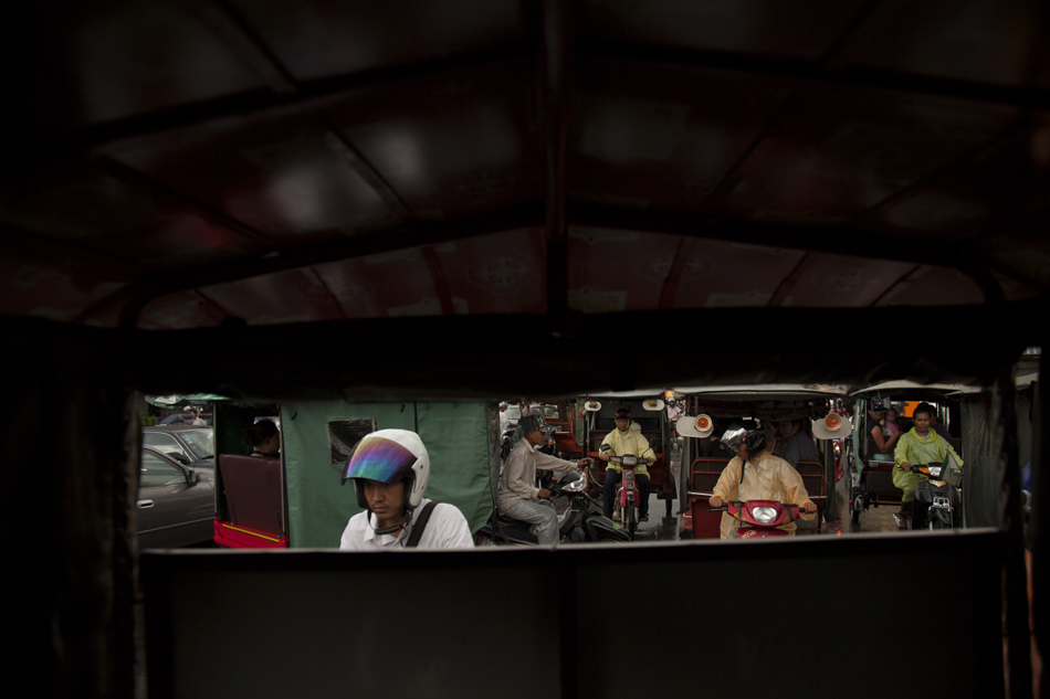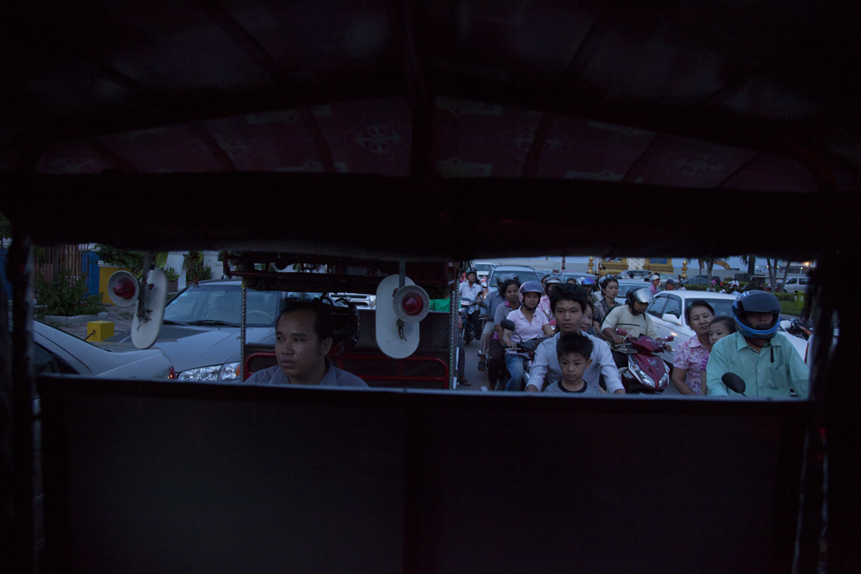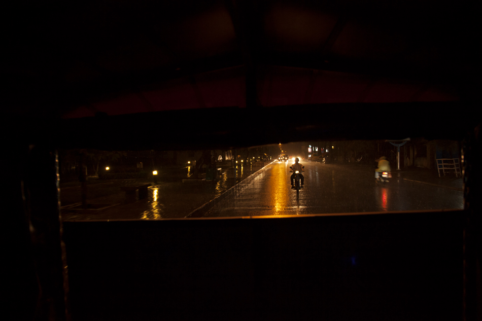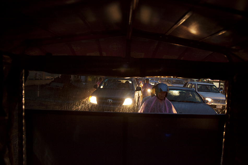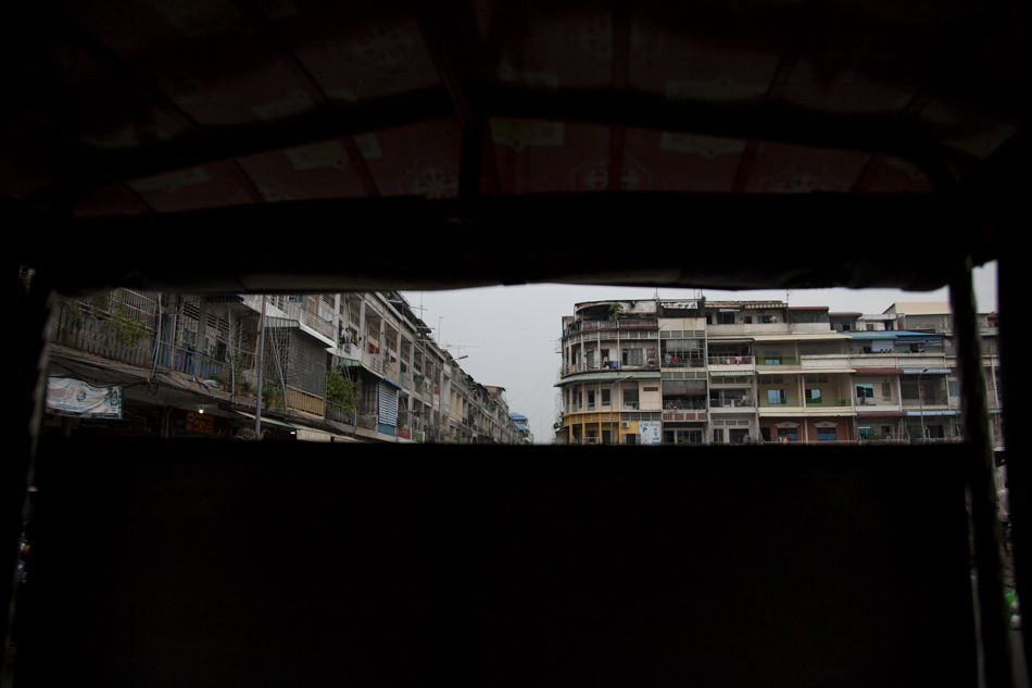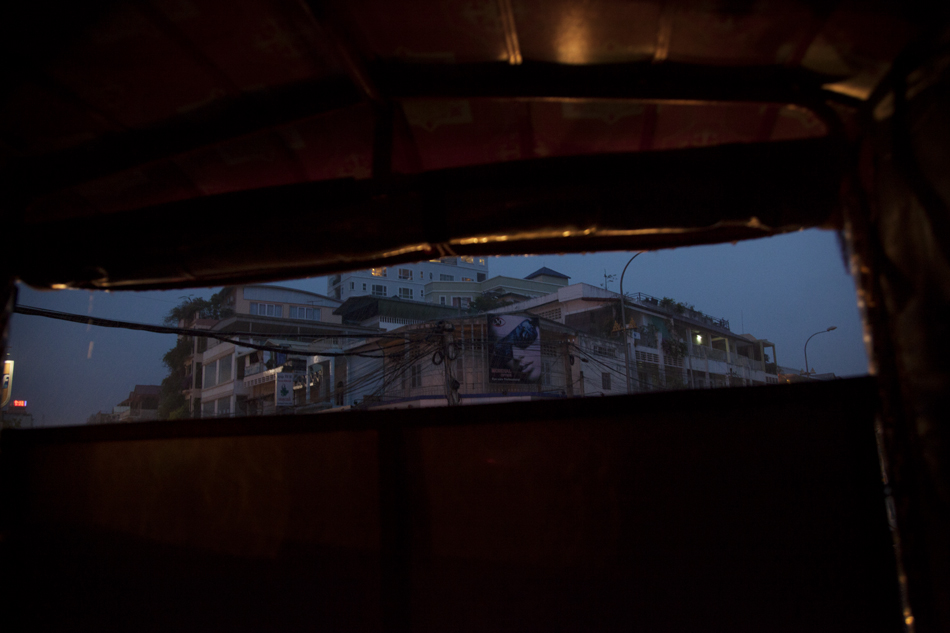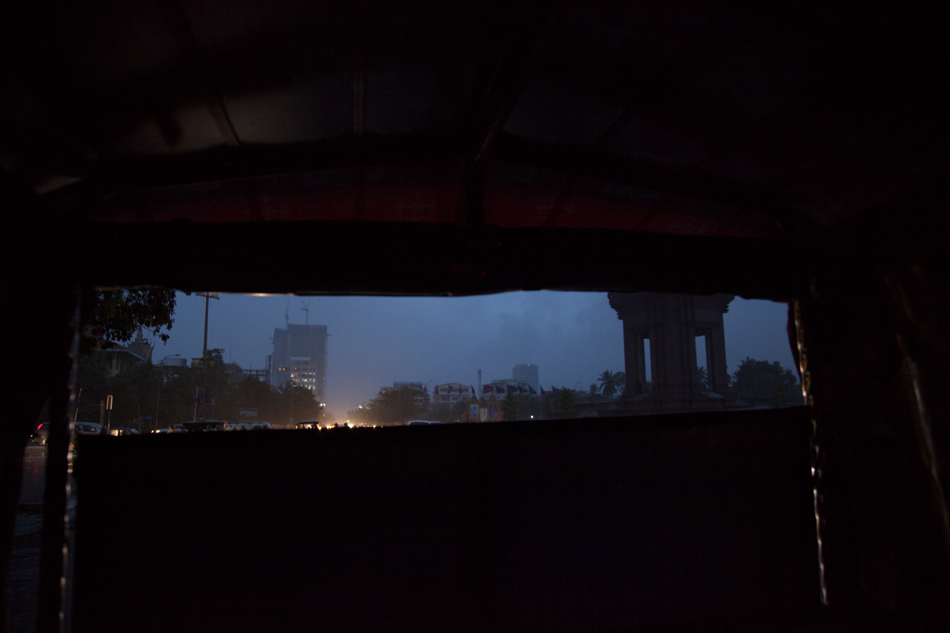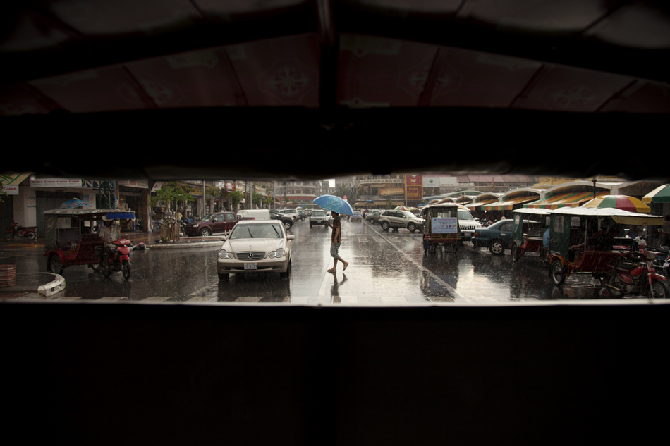 After the fall of the Pol Pot regime, the survivors returned to a city neglected and haunted by the souls that never returned. There is no place without memory, and Phnom Penh is no exception. As the city grows rapidly today, I decided to walk its streets and avenues, squares and alleys, boulevards and dead ends, trying to look through the eyes of those who departed and must not be forgotten. I want to explore the city and reveal its successive layers, past and present, to look towards the future. To observe differently is to see something else and the town’s corners and bends suddenly change. Like a thriller. The rain in the evening, through the attic window of the traditional Tuk Tuk. Faraway, lights are on, small lights in the golden hour on the streets between the new buildings. The rain becomes tears, tears for memory…