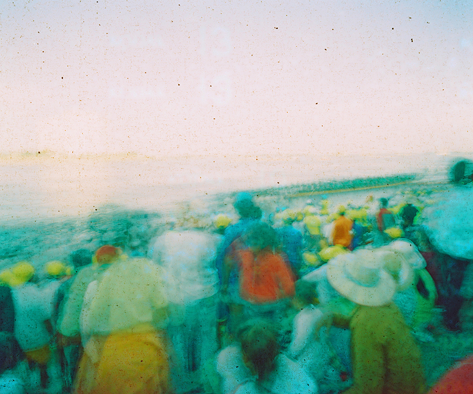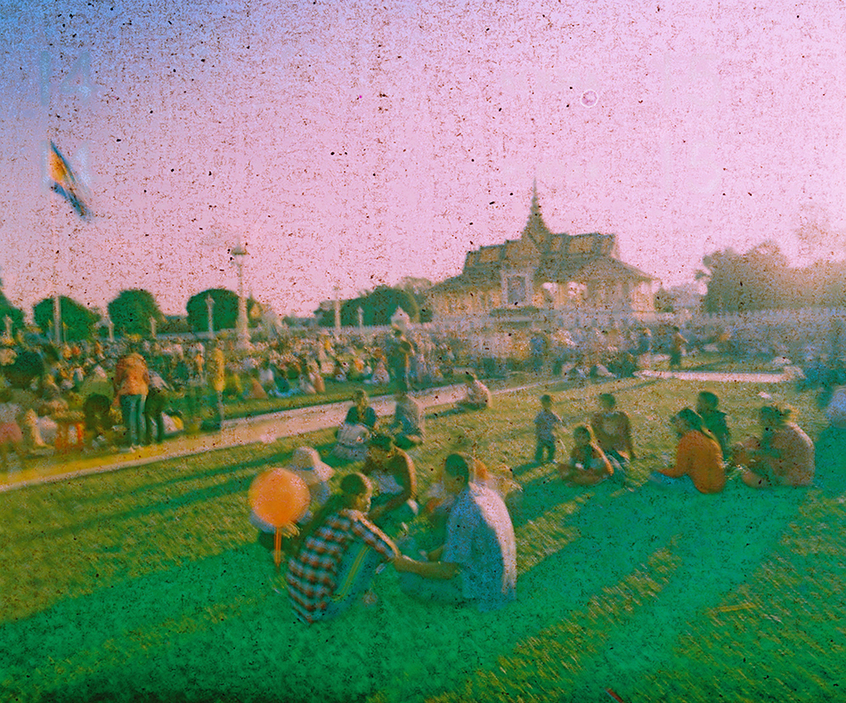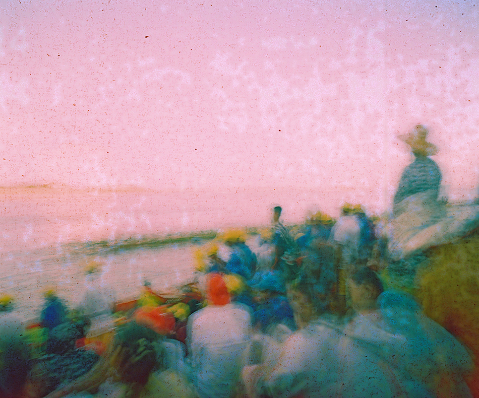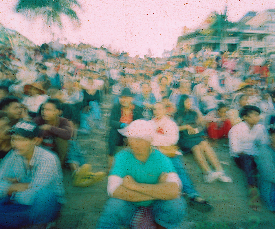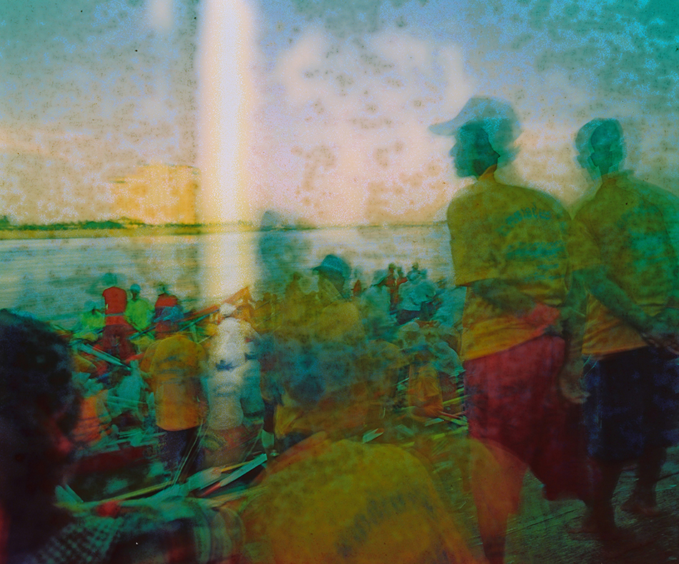Following this tragedy, the Cambodian government decided to cancel the festival for many years. Reasons included fear of another stampede, the possibility of severe flooding, and the political situation. After many years of cancellation, ordinary people in the capital missed the celebrations of this festival. In November 2016, the festival finally retirned. Taking inspiration from the memory of the human stampede, I photographed people gathered along Chaktomouk River, where boats racing took place in front of the Royal Palace. I worked with rolls of negative film that, after shooting, I left undeveloped for two years in unsuitable conditions. Once developed in 2018, they yield unexpected images.
