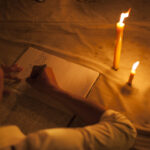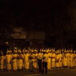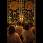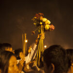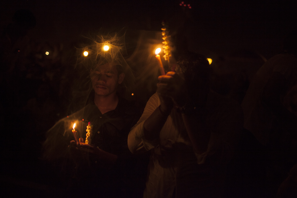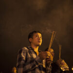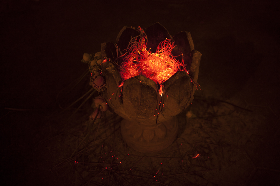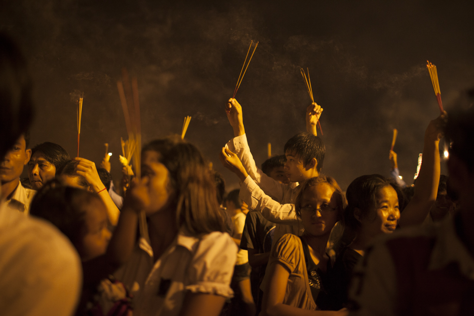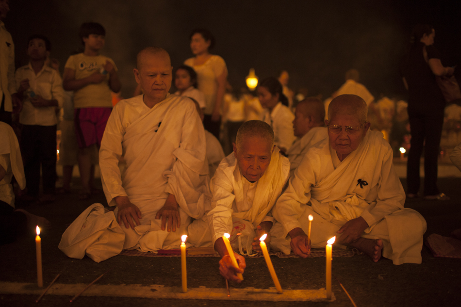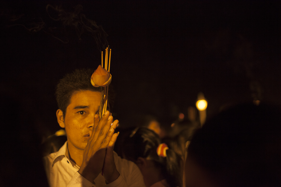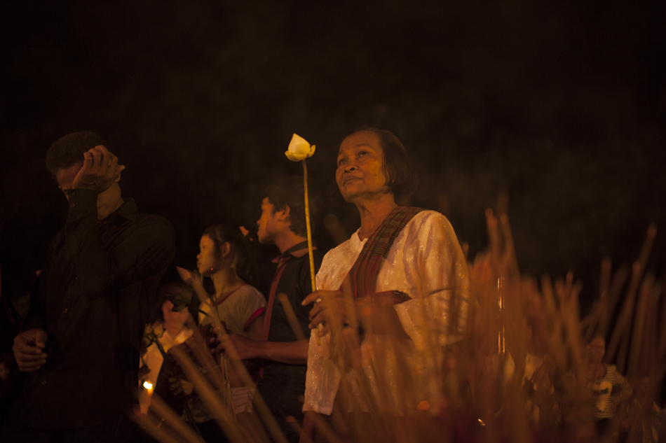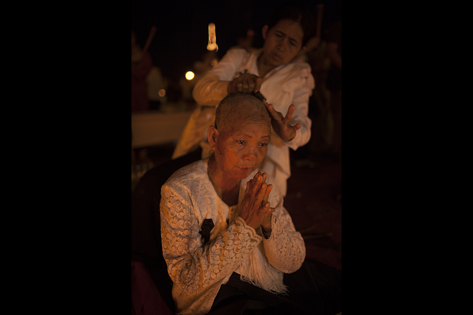 Later on, I learned that Cambodia national broadcaster TVK announced that 1.2 million people had lined the road from Phnom Penh International Airport to the palace that day. That number included myself. The royal government declared seven days of mourning from October 17 to 23, 2012. Mourners came to the palace from across the Kingdom of Cambodia to pay their respects to the King Father. Clouds of smoke from incense and candles made the palace look aflame, creating an atmosphere of spiritual mystery. Buddhism is the state religion of the kingdom and the King Father himself was Buddhist, so the mourning practices followed Buddhist tradition. In Buddhism, monks and nuns shave their heads on holy days as an offering to the Buddha. On this occasion, mourners shaved their heads as offerings along with lotuses and jasmines.