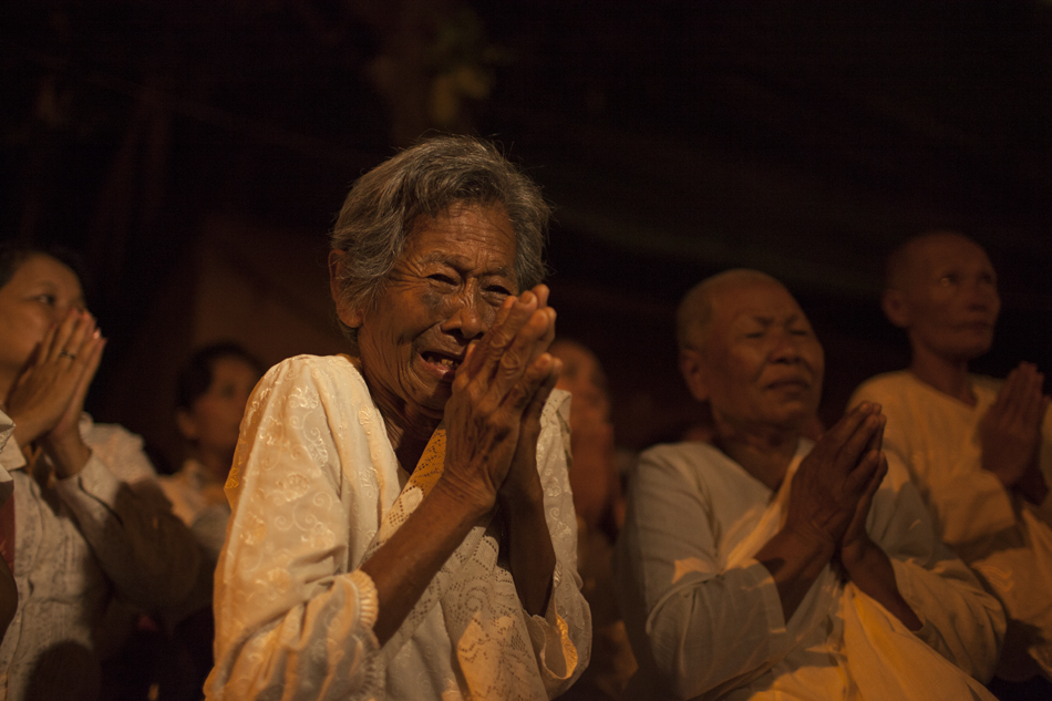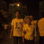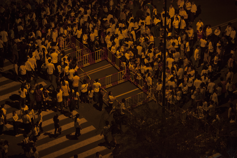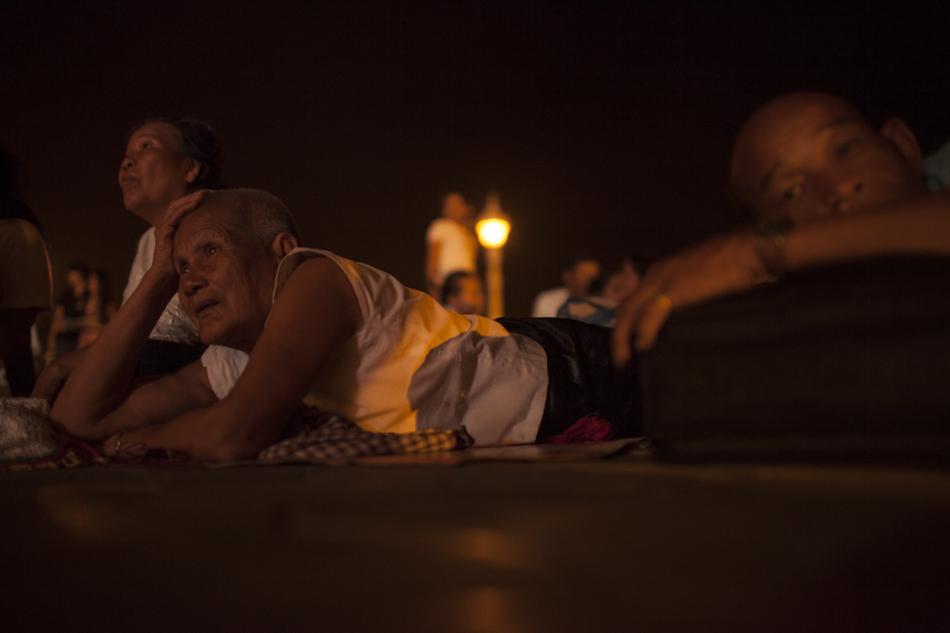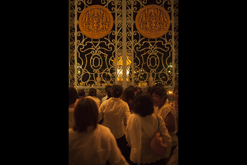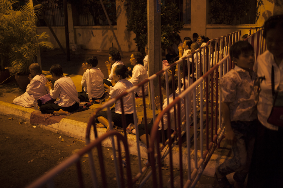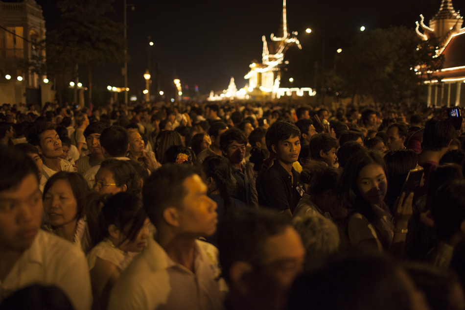 When I arrived home, I immediately changed into mourning clothes: a white shirt, black trousers, a black ribbon on the left side of my chest. With one camera and one lens, I headed  straight to the palace along the riverside via Sisowath Quay. The area was overflowing with the crowd, and I saw many of my friends among them. Policemen and security guards were trying to control the crowd, pushing us from place to place. I asked myself, “Where can I go to be in the best position?” Eventually, I managed to find a spot with other regular citizens near the main entrance. A few minutes later, the vehicle carrying the King Father’s royal coffin passed right in front of me. The voices of old and young people were all mixed together, praying and crying. It was tough. My heart hurt. My tears were falling uncontrollably. A friend of mine told me, “Hak, put your camera down.” But I just could not stop. I kept shooting without any preconceived story in my head.