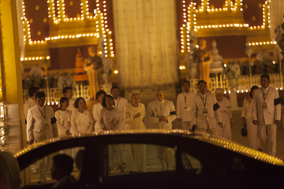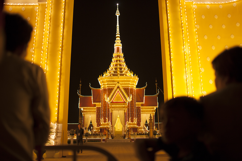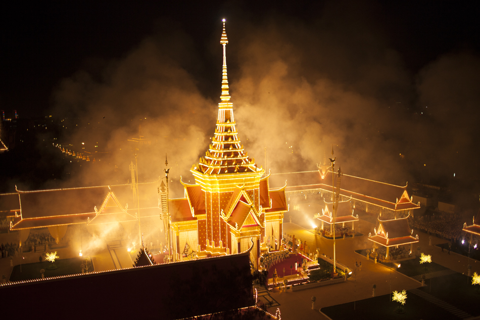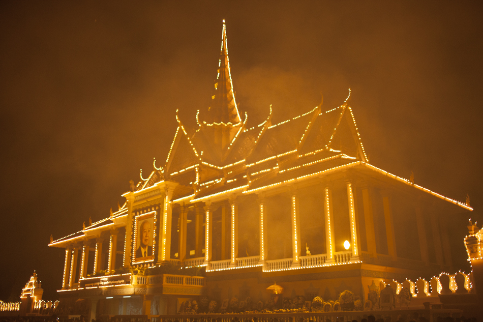 A cremation building was constructed very quickly, in less than two and a half months and beautifully in traditional Khmer style. The King Father’s body remained inside the palace for three months before the official royal cremation ceremony, held February 1 – 7, 2013. When the flames touched the King Father’s body at 6.30PM, on February 4, 2013, I raised my hands above my head in a final show of respect as his last song, “Goodbye Cambodia,” played.